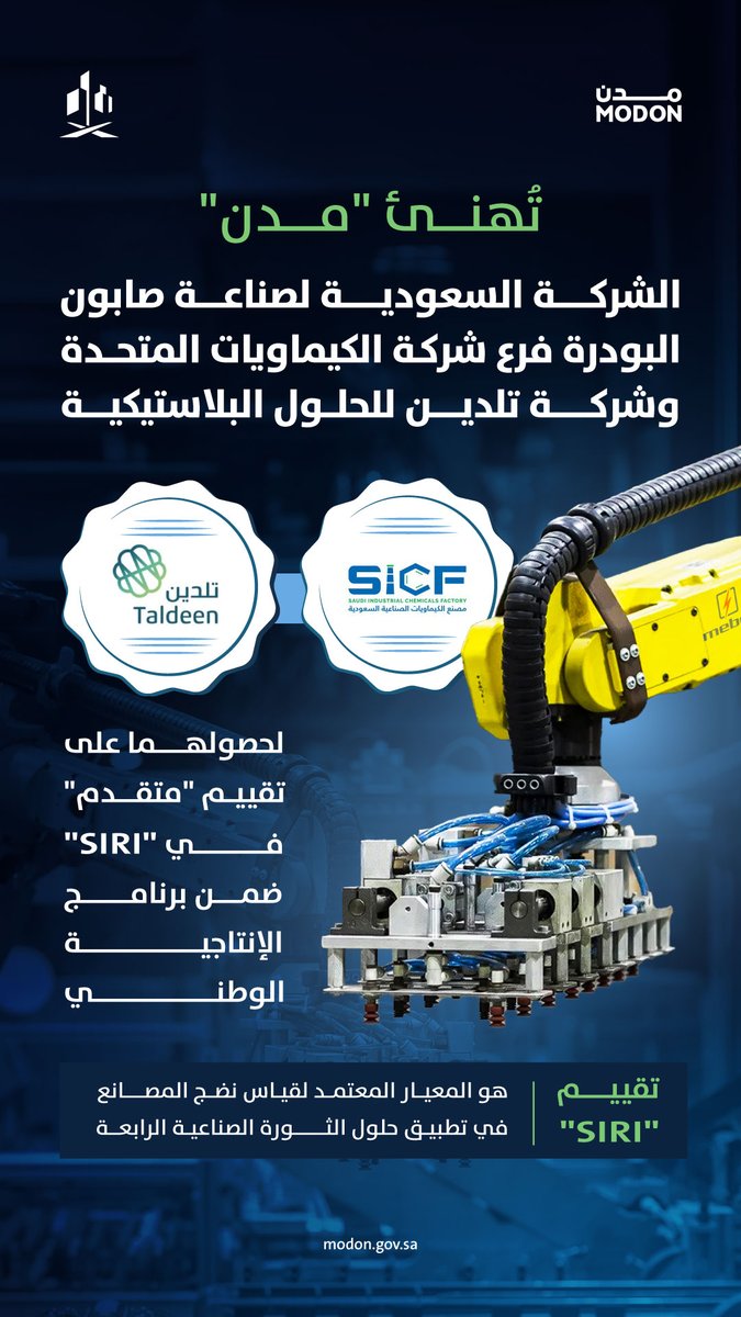 “مدن” تبارك لـ الشركة السعودية لصناعة صابون البودرة فرع شركة الكيماويات المتحدة وشركة تلدين للحلول البلاستيكية لحصولهما على تقييم “متقدم” في سيري (SIRI) ضمن برنامج الإنتاجية الوطني.