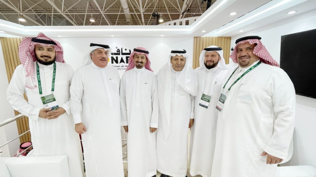 صورة تجمع رئيس اللجنة الزراعية الأستاذ/ عبدالعزيز التويجري والأستاذ/ إبراهيم آل الشيخ رئيس اللجنة الوطنية الصناعية والأستاذ/ حسن الحويزي رئيس اتحاد الغرف السعودية والأستاذ/ فايز الشعيلي نائب رئيس اتحاد الغرف السعودية والأستاذ/ باسم الغدير والأستاذ/ سعد بن حلبان رئيس لجنة الإبل باتحاد الغرف السعودية في جناح شركة ناف للعلف للصناعة في المعرض الزراعي السعودي 2025.