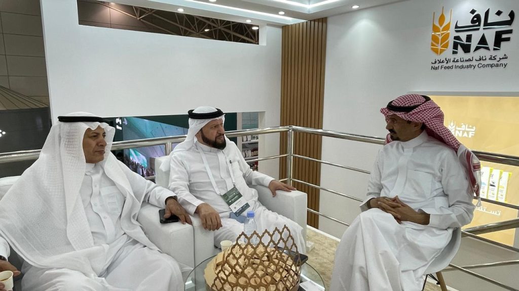 الأستاذ/ فايز الشعيلي رئيس شركة ناف لصناعة الأعلاف ورئيس اتحاد الغرف السعودية الأستاذ/ حسن الحويزي ورئيس اللجنة الصناعية الأستاذ/ إبراهيم آل الشيخ في جناح شركة ناف لصناعة الأعلاف