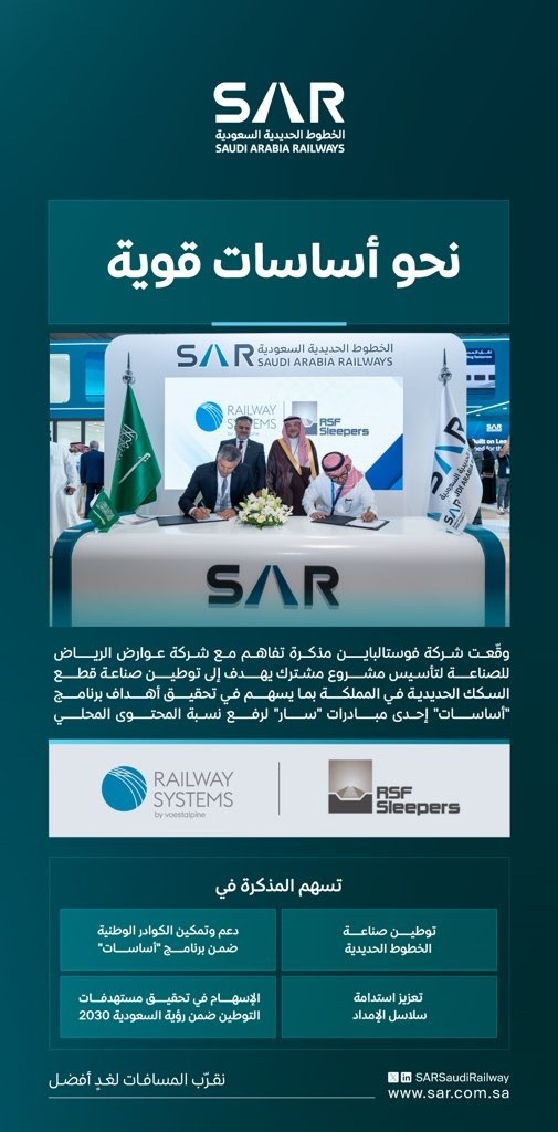 نحو أساسات قوية… وقعت شركة “فوستالباين” وشركة “عوارض الرياض” مذكرة تفاهم لتوطين صناعة قطع السكك الحديدية في المملكة بما يسهم في تحقيق أهداف برنامج “أساسات” إحدى مبادرات “سار” لرفع نسبة المحتوى المحلي. نقرّب المسافات لغدٍ أفضل