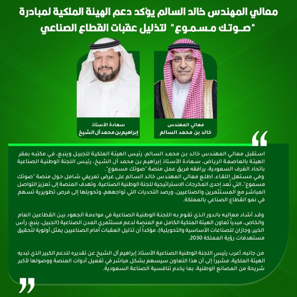 معالي المهندس خالد السالم يؤكد دعم الهيئة الملكية لمبادرة “صوتك مسموع” لتذليل عقبات القطاع الصناعي