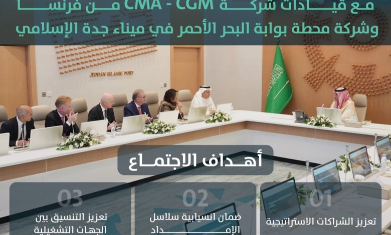 اجتمع سعادة رئيس الهيئة العامة للموانىء (موانئ) المهندس سليمان المزروع مع قيادات شركة CMA CGM الفرنسية ومحطة بوابة البحر الأحمر في ميناء جدة الإسلامي، لبحث تعزيز الشراكات ورفع كفاءة العمليات ودعم سلاسل الإمداد