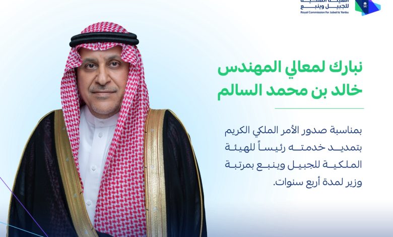 صدور أمر ملكي كريم بتمديد خدمة معالي م. خالد بن محمد السالم رئيساً للهيئة الملكية للجبيل وينبع بمرتبة وزير